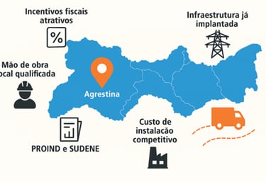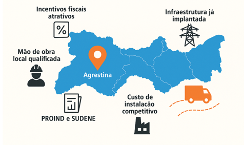 A localização em Agrestina – PE garante incentivos fiscais estratégicos como PROIND (redução de ICMS) e SUDENE (redução de IRPJ), além de proximidade com centros produtivos e tecnológicos do Nordeste.